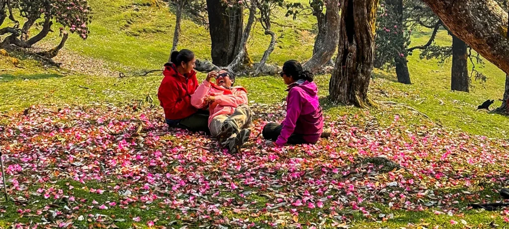 Encountering Rhodos on a Himalayan trek is not rare in our country. If you time it right, you get to trek amidst these flowers on many treks like Deoriatal Chandrashila, Sandakphu, and Goecha La. At Indiahikes, we have trekked amidst blooming rhododendrons countless times. Yet, nothing matches up to what we experienced at Ranthan.